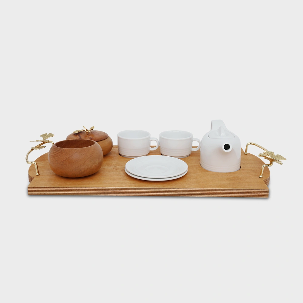 سرویس چای خوری چینی 2 نفره ما، با اون طراحی ظریف و دوست داشتنی اش، این لحظه ها رو براتون خاطره انگیزتر می کنه. این سرویس هر چیزی که برای یه دورهمی چای گرم و صمیمی لازم دارین رو داره: دو تا فنجون شیک، دو تا نعلبکی، یه قندان چوبی دردار، یه کاسه کوچولو برای نقل و نبات، یه قوری چای و یه سینی چوبی با دسته های فلزی که روشون پروانه نشسته.