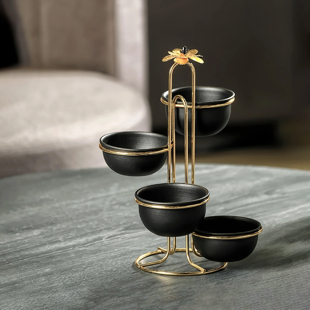 طراحی چشمنواز و کاربردی: این استند پذیرایی با طراحی خاص و مدرن خود، شامل چهار کاسه مشکی مات با لبههای طلایی درخشان است که بر روی یک پایه فلزی طلایی رنگ با انحناهای زیبا قرار گرفتهاند. جزئیات ظریف گلمانند در قسمت بالایی، جلوهای هنری و دلنشین به آن بخشیده است. این ترکیب رنگ کلاسیک و لوکس، به راحتی با هر سبک دکوراسیونی، از مدرن و مینیمال گرفته تا کلاسیک و اشرافی، هماهنگ میشود.